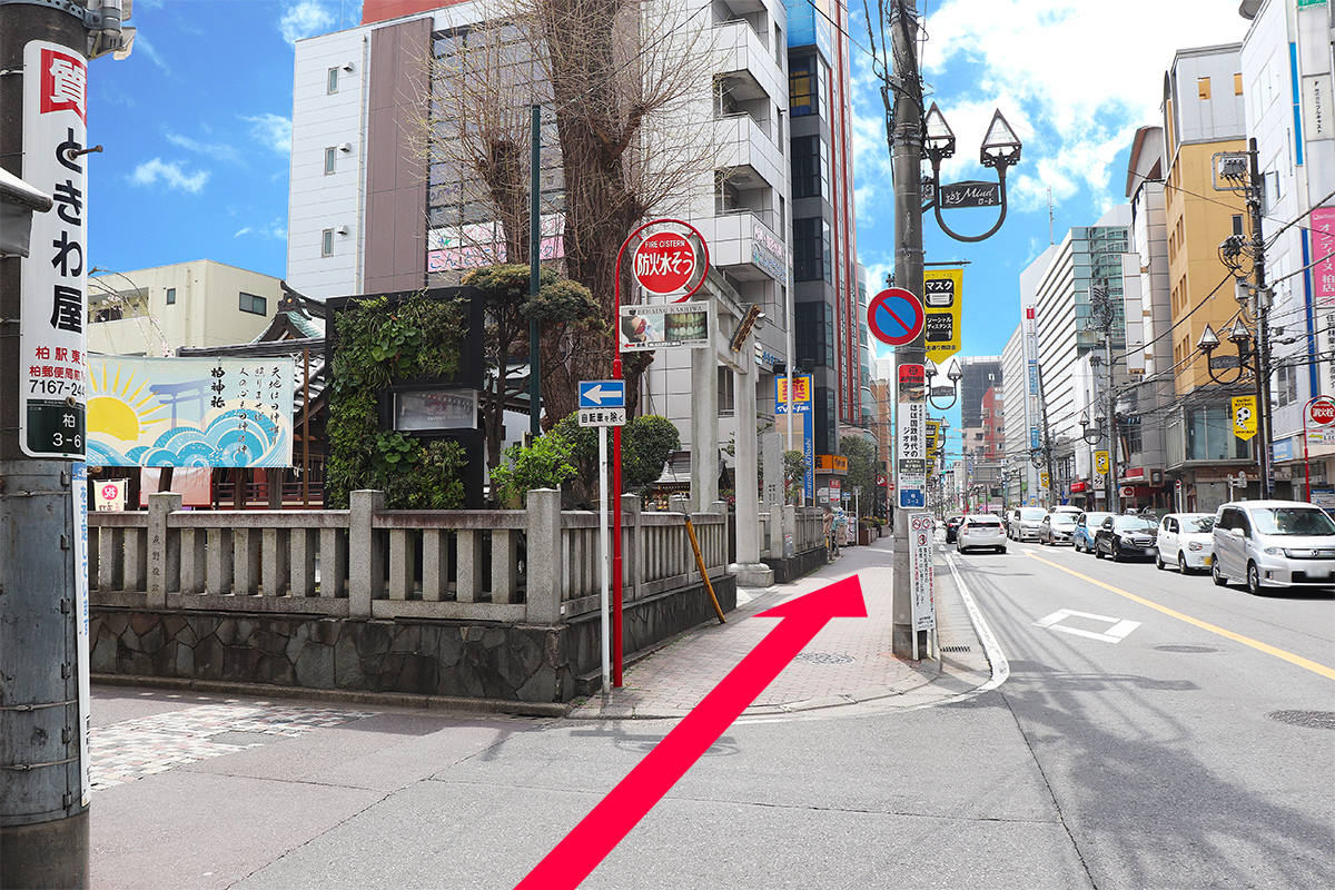 5. 柏神社を通過し、次の信号機のある交差点(旧水戸街道とセントラルパル通り・市川柏線の交差点)まで直進します。